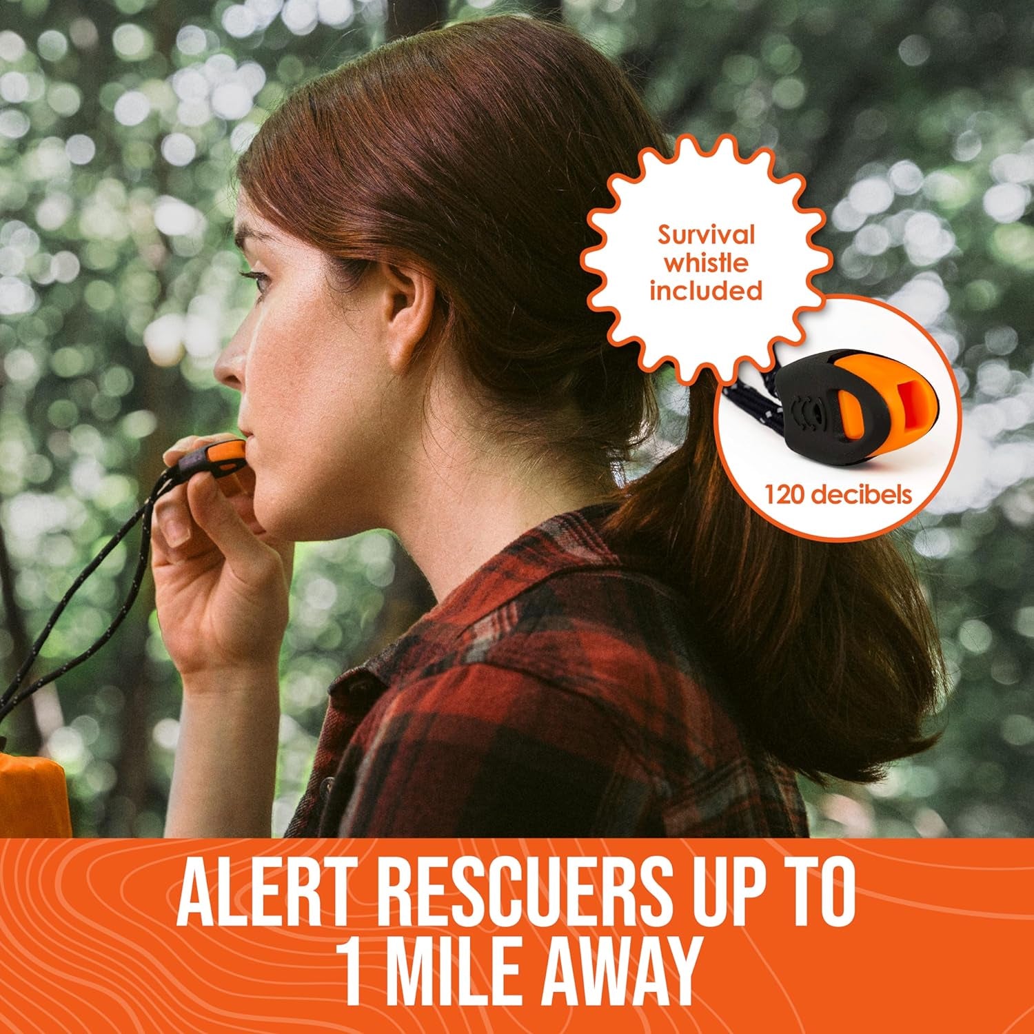 The drawstring features a detachable survival whistle capable of reaching 120 decibels to alert rescuers up to a full mile away.