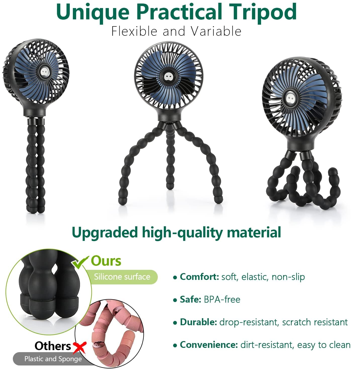 • 【Upgraded Flexible Unbreakable Tripod】snawowo baby stroller fan has an upgraded tripod which is made of high quality bendable metal and food grade silicone surface instead of the old plastic and sponge surface. so you don't have to worry about the baby eating it by mistake. The tripod is waterproof, not easy to get dirty and broken, easy to clean, and more anti-wear.