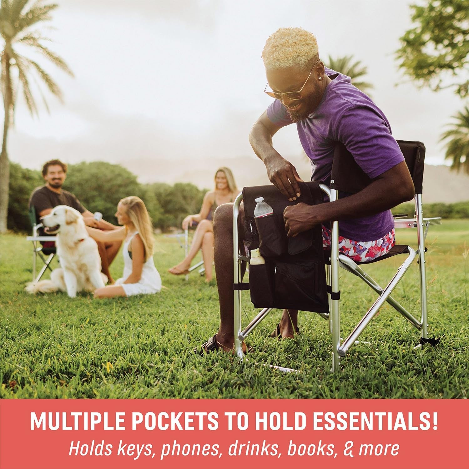 The accessories panel on this picnic chair offers a variety of pockets to hold personal items.